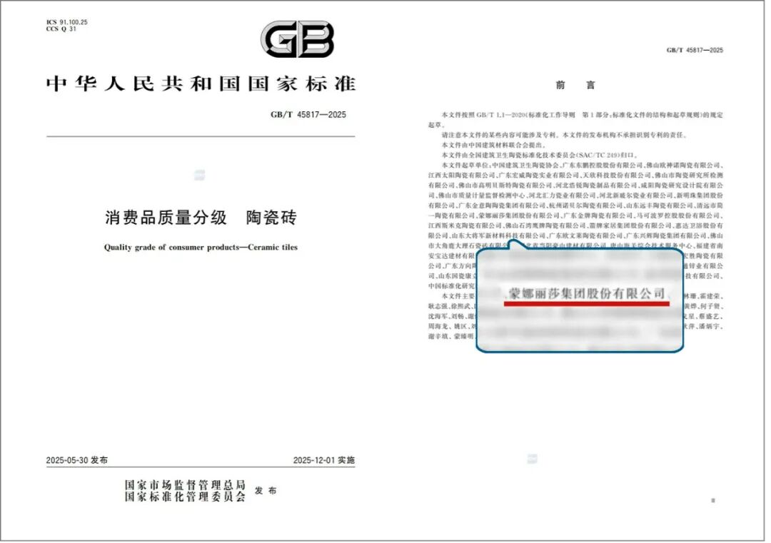 蒙娜丽莎集团是《消费品质量分级 陶瓷砖》起草单位之一