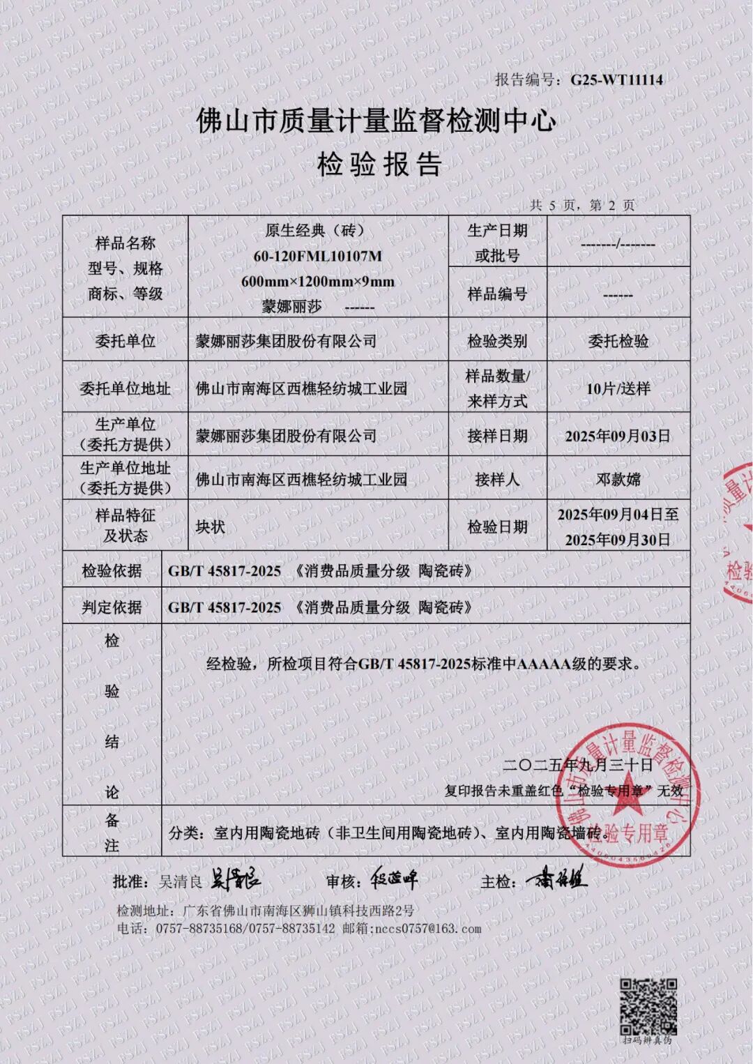 蒙娜丽莎凭借扎实的科研实力和技术积累,系统解决了原料配比、烧成工艺、功能性控制等一系列技术难题。其首批送检的陶瓷砖产品,是蒙娜丽莎 2025 年的主打高端系列,涵盖了多种主流规格与花色,经国家级权威检测机构严格测试,全面达到GB/T45817-2025《消费品质量分级 陶瓷砖》中的AAAAA级。
